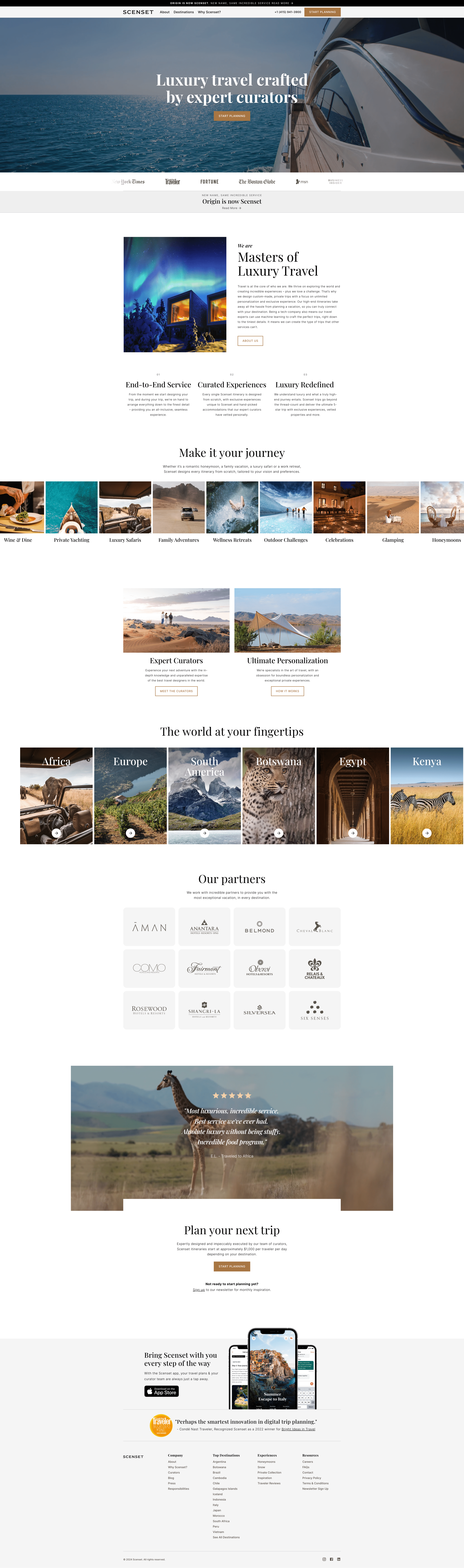 In 2023, Origin Travel decided to rebrand to Scenset, to make the product a better fit for a high-net worth travel, and for SEO reasons as Origin is pretty tricky to find. We needed to move on this quickly, and so I rewrote the landing page and social assets, and also created all of the comms to communicate this change to current and potential travellers.